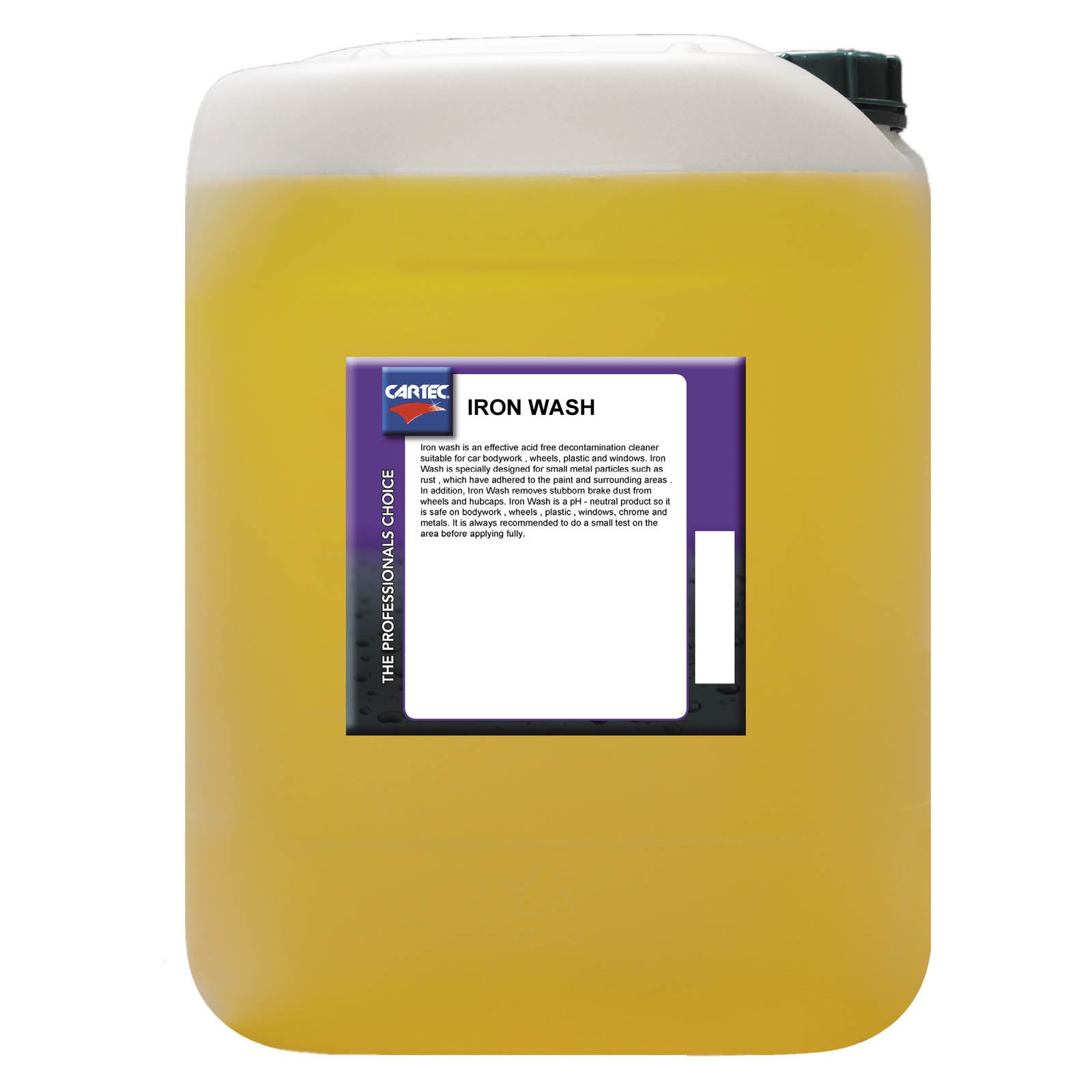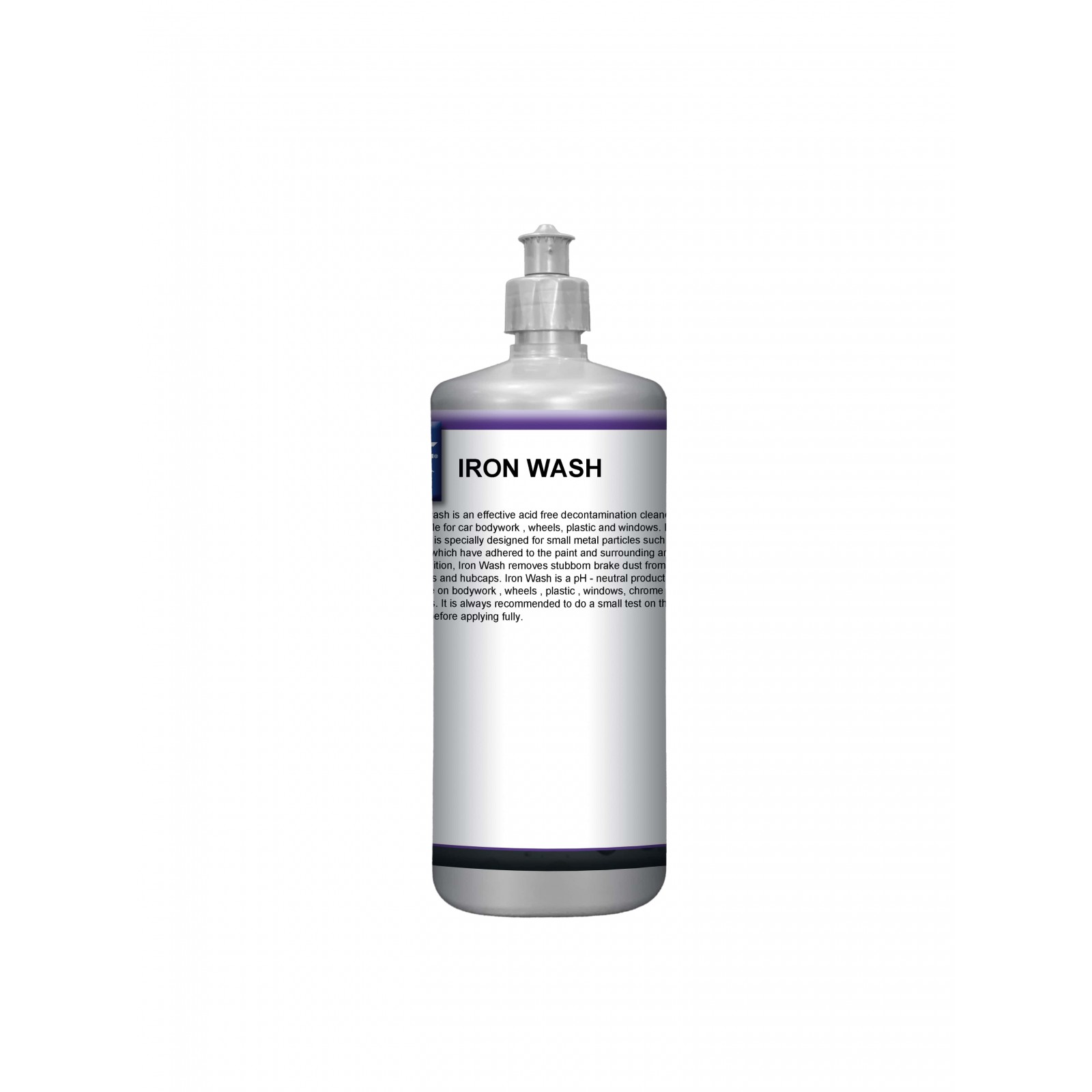 Iron wash is een effectief reinigingsmiddel voor het reinigen van de autolak, velgen en ramen. Iron Wash is speciaal ontwikkeld om kleine metaaldeeltjes zoals vliegroest, die zich aan de lak hebben gehecht, op een snelle wijze te verwijderen. Daarnaast verwijdert Iron Wash de hardnekkige remstof van velgen en wieldoppen. Iron Wash is een PH-neutraal product waardoor het in principe geen schade kan aanrichten aan lakken, velgen, wieldoppen, ramen, chroom- en metaalsoorten. Toch is het aanbevolen om altijd een kleine test te doen op het te behandelen oppervlak alvorens het product volledig in te zetten.